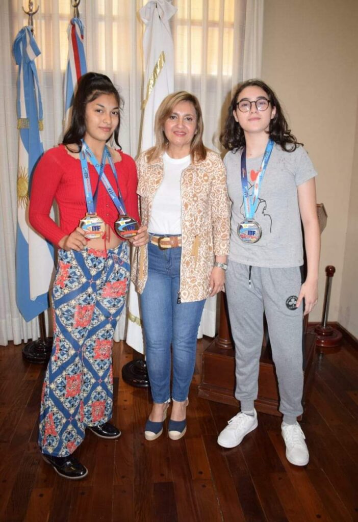 La intendente de la Capital, Ing. Norma Fuentes, recibió a las campeonas de Taekwondo, Solange Orona y Rosario Giménez, en el Salón de Acuerdos de la Municipalidad de la Capital, quienes compitieron en el último mundial de la especialidad disputado en el Nodo Tecnológico.