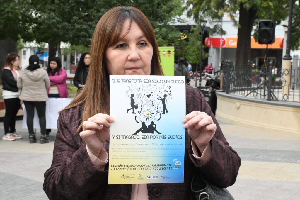 En el marco del Día Mundial contra el Trabajo Infantil, la Subsecretaría de la Niñez, Adolescencia y Familia y la Secretaría de Trabajo de la provincia realizaron acciones de promoción y prevención con stand informativo y folletería en la retreta de la Plaza Libertad.