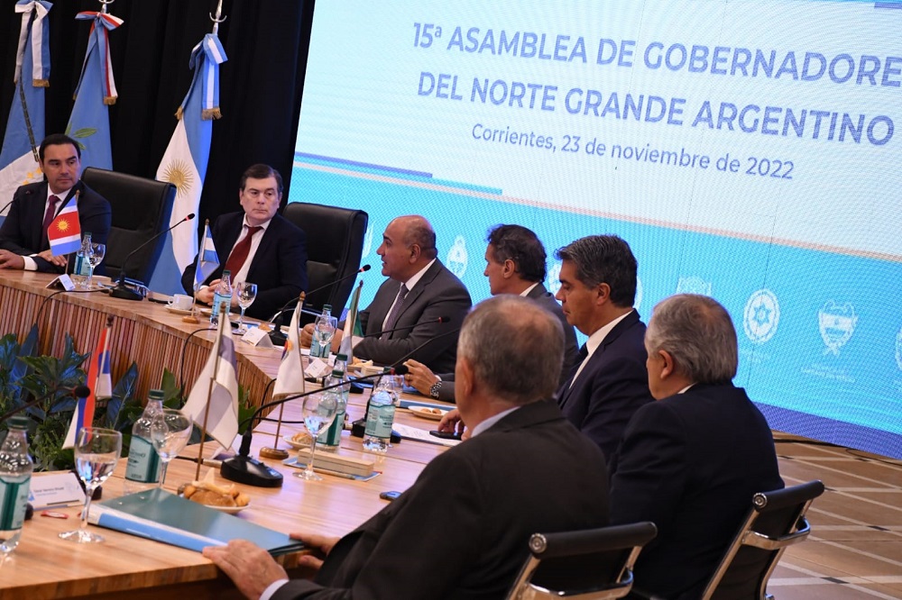 También fueron parte el jefe de Gabinete de Ministros de la Nación, Juan Manzur; el titular del Consejo Federal de Inversiones, Ignacio Lamothe, y los ministros nacionales de Desarrollo Social, Victoria Tolosa Paz; del Interior, Eduardo Wado De Pedro; de Desarrollo Territorial y Hábitat, Santiago Maggiotti y de Obras Públicas, Gabriel Katopodis. El gobernador de Santiago del Estero, Gerardo Zamora, en su condición de presidente pro témpore del Consejo Regional, encabezó la reunión que tuvo como anfitrión a Gustavo Valdés, quien dio la bienvenida a los funcionarios nacionales y a sus pares de Chaco, Jorge Capitanich; de Jujuy, Gerardo Morales; de Tucumán, Osvaldo Jaldo; de Formosa, Gildo Insfrán; de Catamarca, Raúl Jalil; de La Rioja, Clemente Quintela; de Misiones, Oscar Herrera Ahuad y de Salta, Gustavo Sáenz. Tras cuatro horas de reunión se dieron a conocer las conclusiones sobre temas como el transporte, la energía y el corredor bioceánico, otros que tienen que ver con el comercio exterior, la Agencia de Desarrollo del Norte Grande; el avance de la misión a la República Árabe de Egipto, donde se realizó la COP 27 y también en El Cairo. Se acordó además una campaña de promoción conjunta con las diez provincias en la Costa Atlántica y el plan de acción sobre los Objetivos de Desarrollo Sostenible (ODS). También se trataron inquietudes de la Cámara Argentina de Libros, el Consejo Agro Industrial Argentino, y de la Confederación Argentina de la Mediana Empresa y con el apoyo del Consejo Federal para las Políticas, Medio Ambientales. A partir de un pedido de la Came sobre el decreto 814, los gobernadores propusieron reducir las contribuciones patronales, modificar la actualización del monto mínimo, pasando de $ 7.000 a $23.000. También, analizaron la situación del troceo en la industria frigorífica. Finalmente se resolvió fijar el 16 de febrero de 2023 como fecha de la 16° Asamblea de Gobernadores del Norte Grande, en La Rioja, donde también se hará la elección del presidente pro témpore del cuerpo.