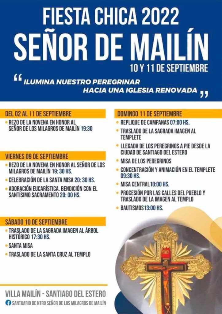 Bajo el lema «Ilumina nuestro peregrinar hacia una Iglesia renovada», se vivirá un triduo desde el viernes 9 al domingo 11, día de la celebración central. Además desde el día 2 de septiembre se llevará a cabo la novena en honor al Señor de Mailín.