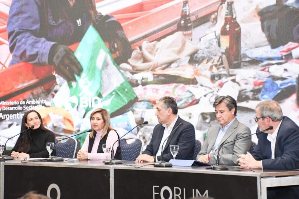 La mesa panel de Conclusiones, Retos y Oportunidades para la Girsu y la Economía Circular en Argentina estuvo integrada por la intendente Fuentes; el intendente de La Banda, Roger Nediani; por Henry Moreno especialista Senior INE/WSA BID y Carlos Silva, del Ministerio de Ambiente y Desarrollo Sostenible de Argentina.