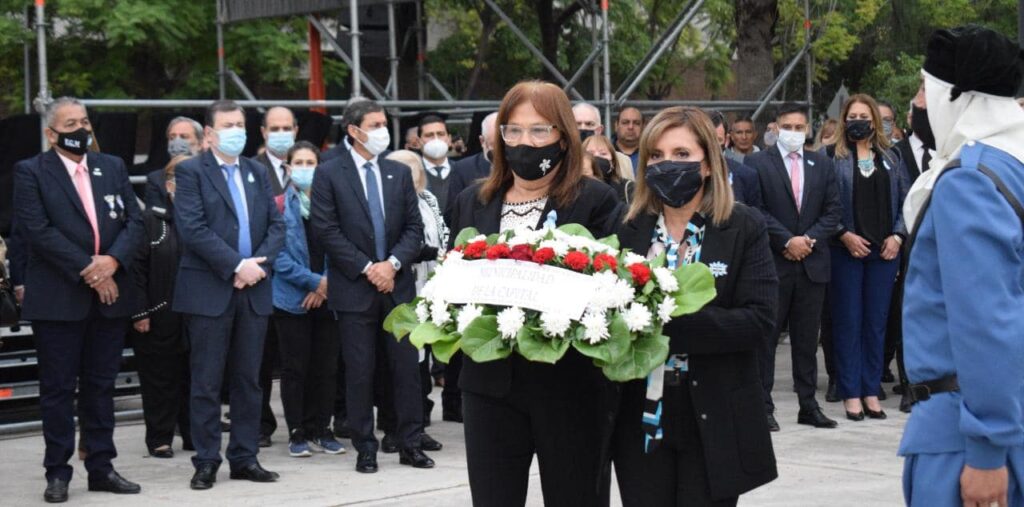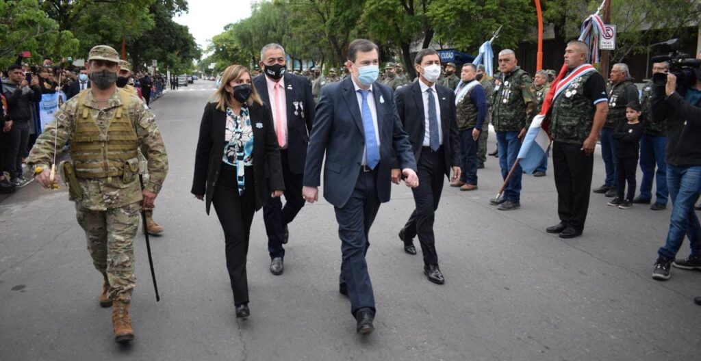 La jefa comunal acompañó al mandatario en la revista a las tropas en la colocación de ofrendas florales al pie del monumento a los caídos y presenció el desfile cívico militar desde el palco principal, donde también estuvieron presentes el Vicegobernador Carlos Silva Neder, el presidente del Centro de Veteranos de Malvinas, David Díaz, autoridades judiciales, legislativas, municipales, militares y familiares.