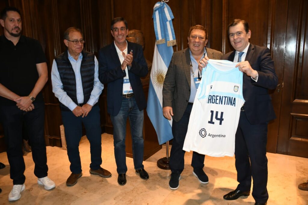 Por su parte, las autoridades de Fiba le entegaron la camistea del basquetbolista santiagueño Gabriel «Tortuga» Deck, «en reconocimiento al apoyo al deporte como política de estado».